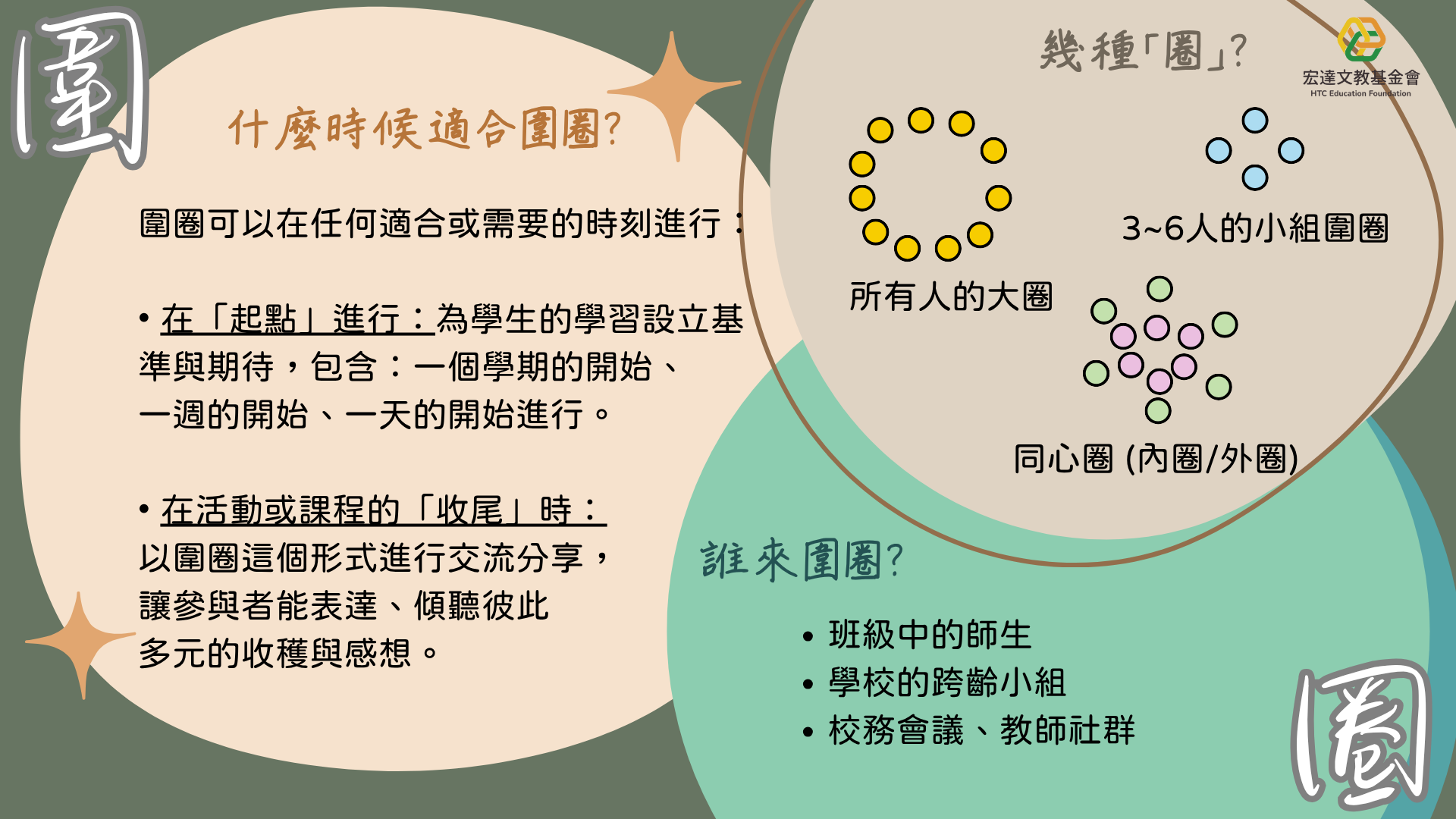 - 引導者本身要清楚使用圍圈的目的與意義:交流的方式?建立關係與互動?