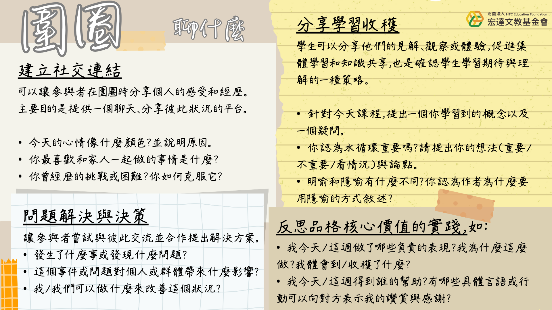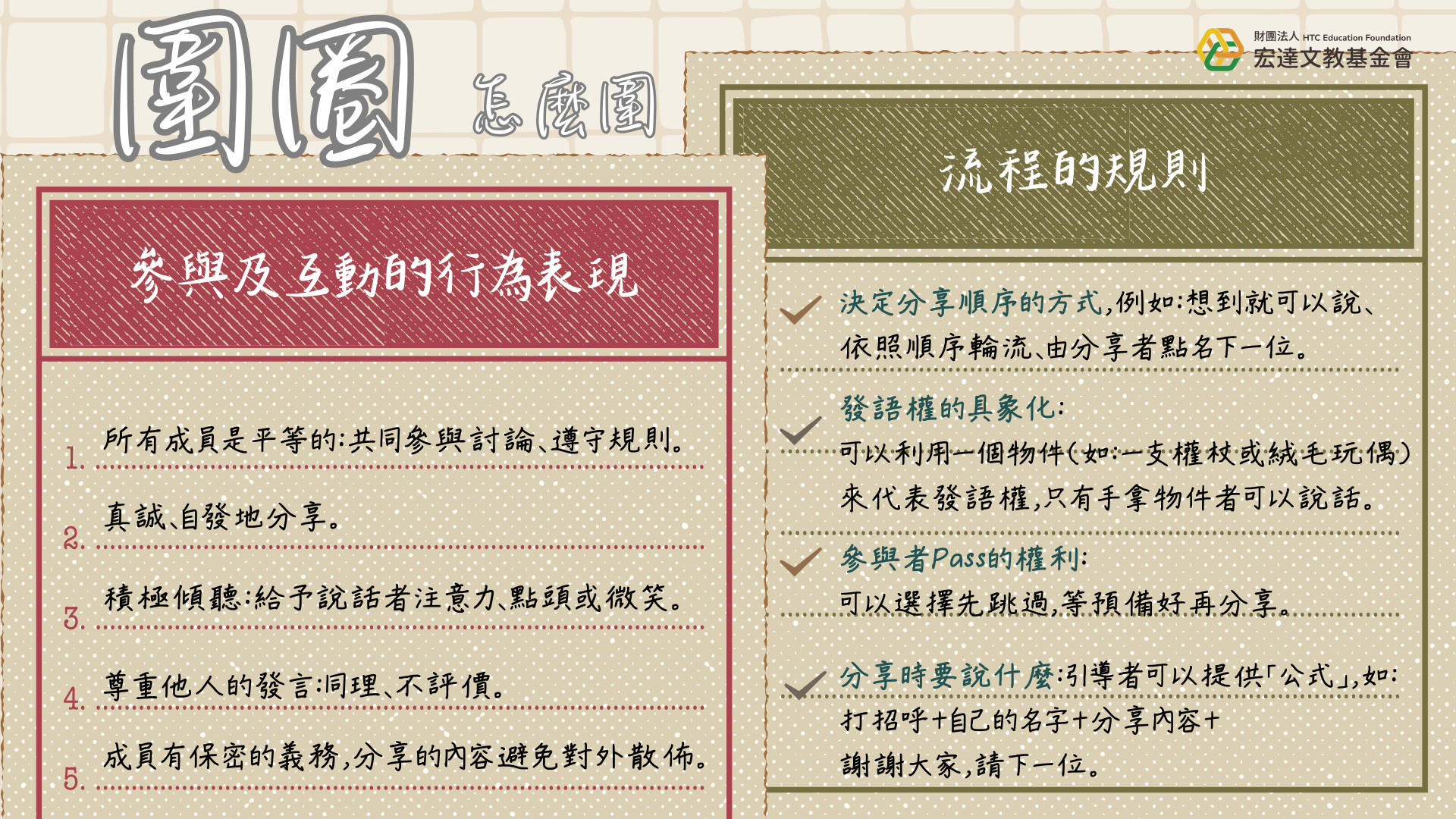 - 點出「分享過程」的意義:等待發言的感受、如何保持專注聽別人的分享、聽到他人想法與對自己的幫助、圍成一圈給人的感受……等等。
