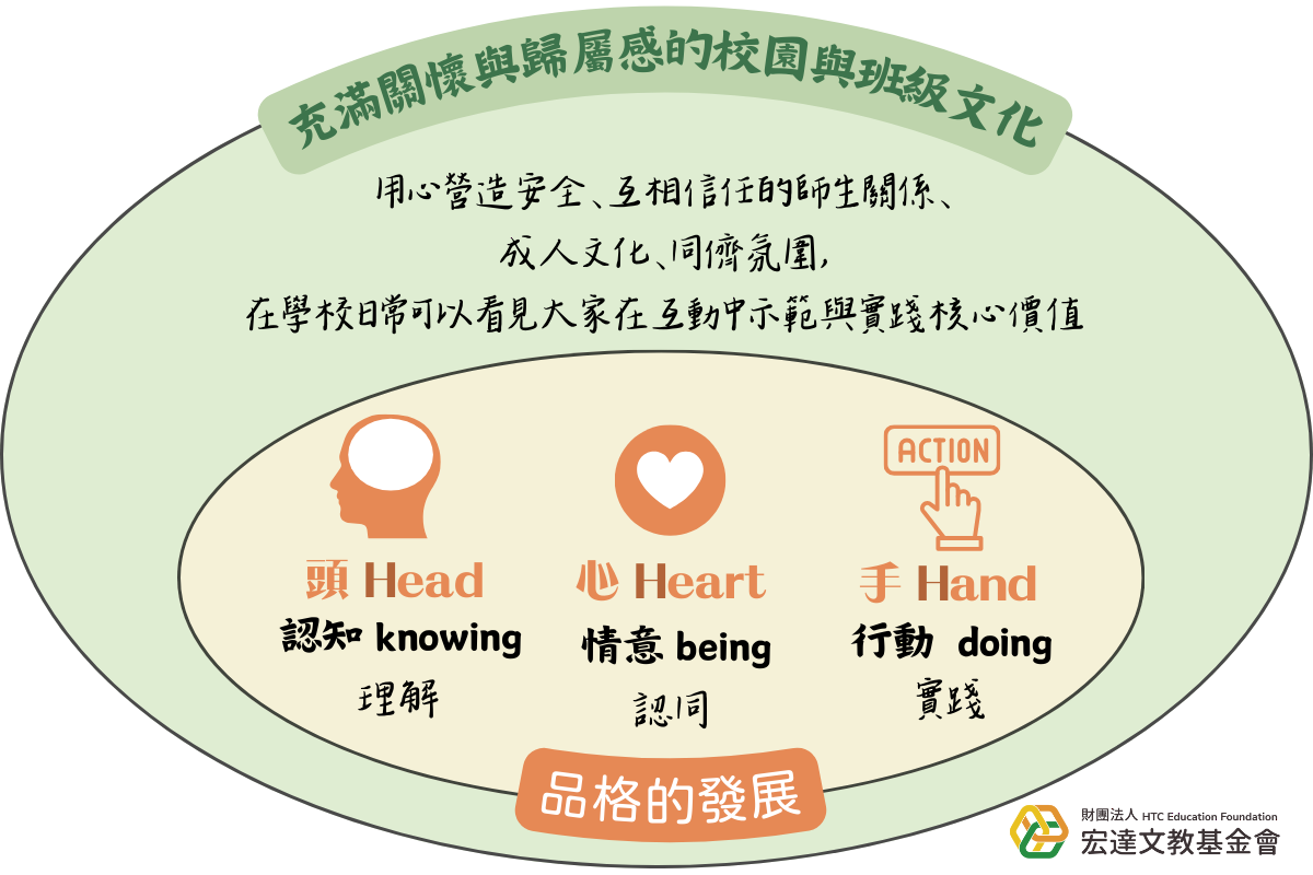 教育者在規劃教學之外也要考量到,孩子發展品格的歷程中,最關鍵的基礎其實是他們所處的環境與身邊的成人。因此,校園環境與氛圍,讓孩子能在穩定、安全的環境中培養品格。這也是宏達文教基金會推動的品格教育模式「雙翼」,品格教育應重視「全人的深入發展」及「全校的廣泛實施」,我們期待學校將品格融入在校園生活的每個層面,並且深入到每個孩子的頭、心、手。