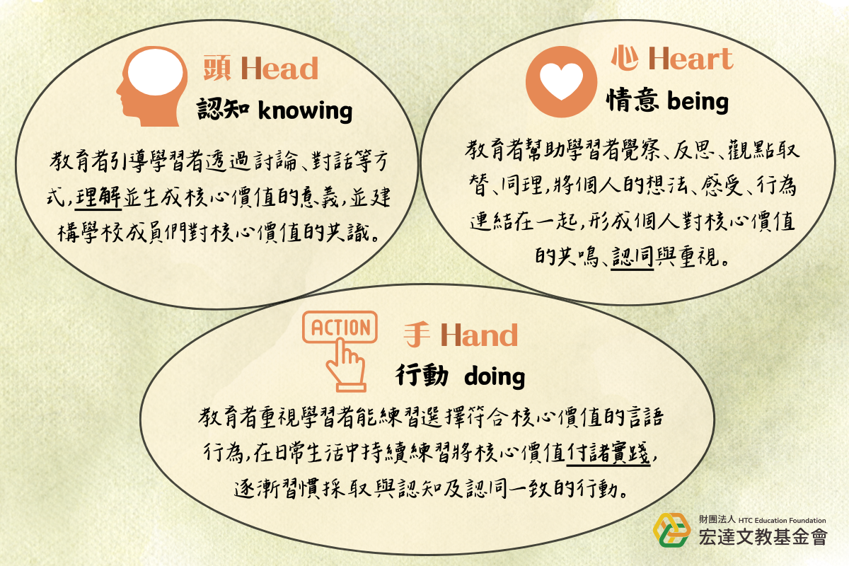 完整的品格發展,應包含理解、關注與實踐核心價值,又被稱為品格發展的「3H--頭、心、手」:
