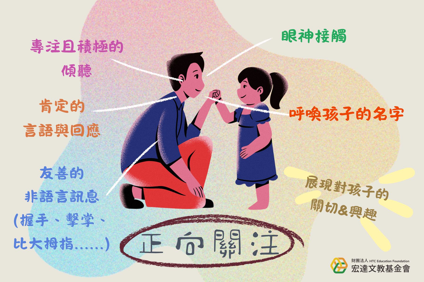「正向關注」指的是用積極、關愛的言語及肢體語言滿足孩子對情感與自我價值的需求。《SEL 全方位實踐指南:掌握腦科學的社會情緒學習80+》一書中提及了許多問候的要點,都與正向關注的重要元素重疊,整理為以下五點: