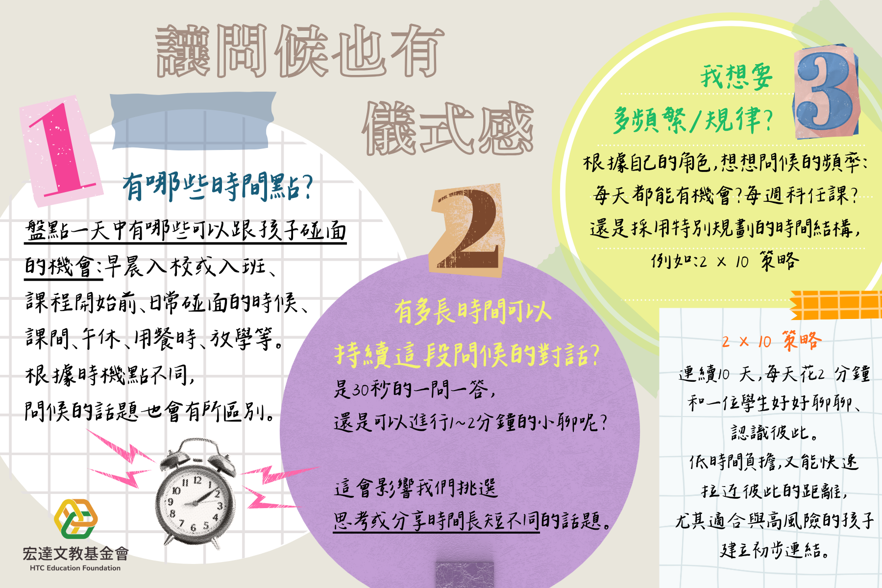 思考這三個問題的另一個好處是可以幫助教師在日常互動中更有意識地安排問候的時機與話題。