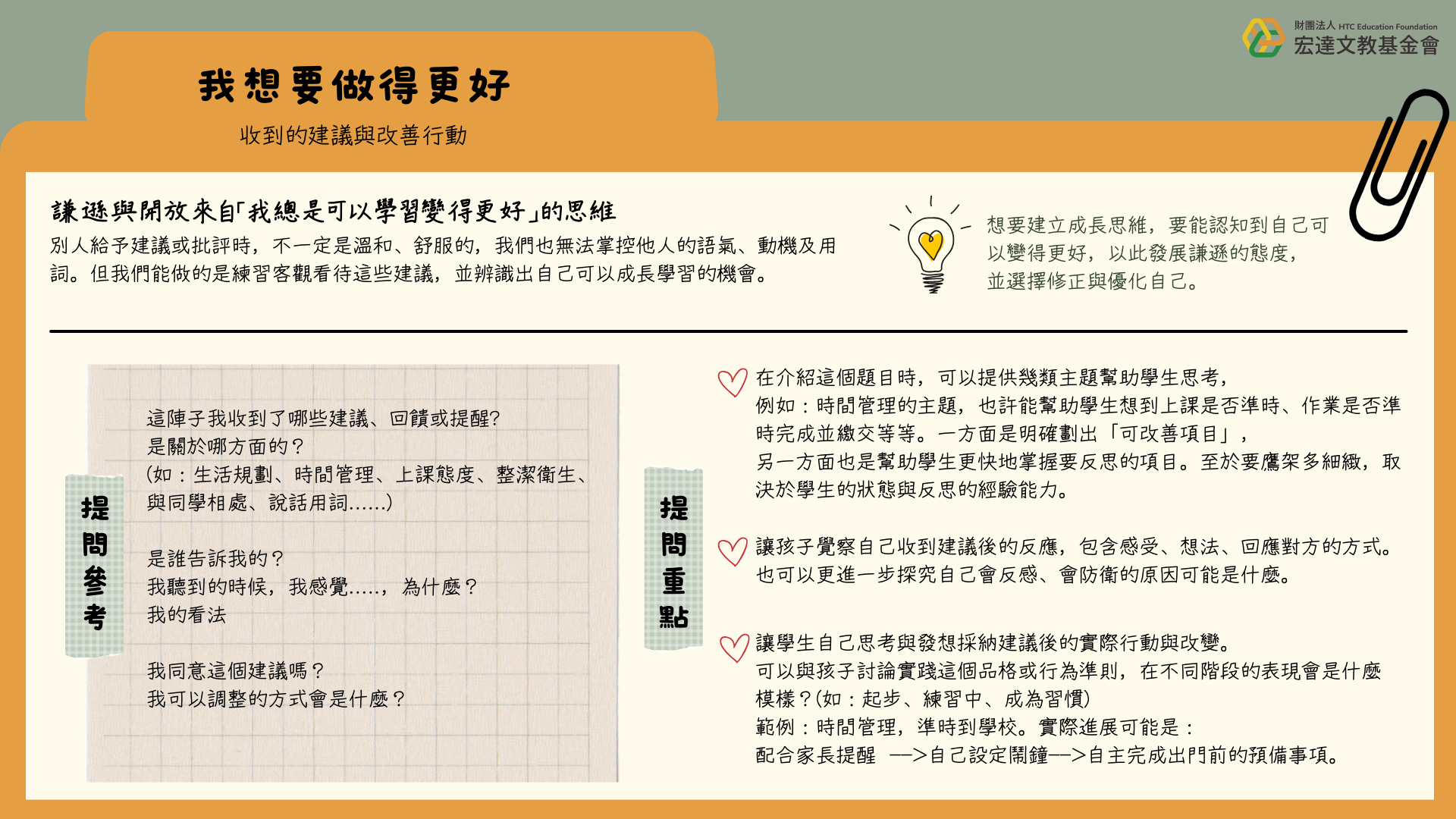 別人給予建議或批評時,不一定是溫和、舒服的,我們也無法掌控他人的語氣、動機及用詞。但我們能練習客觀看待這些建議,並辨識出自己可以學習的機會。這個主題目的是讓孩子練習聚焦在自己的進展與改善空間,慢慢養成砥礪自己成長的習慣。