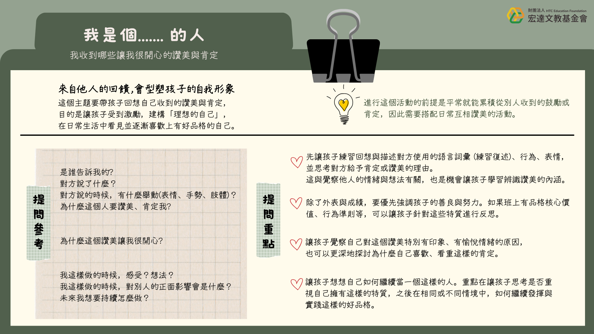 ◼︎ 老師也可以先想想:「自己喜歡收到什麼樣的讚美?什麼樣的讚美激勵了你?為什麼?」並以此作為範例與學生分享。